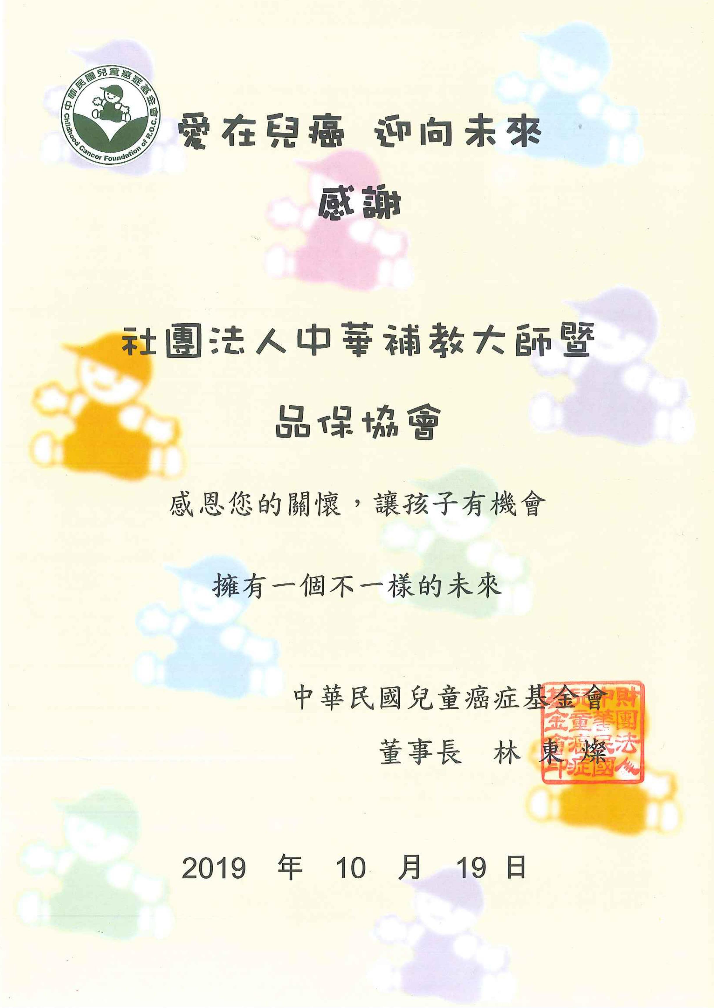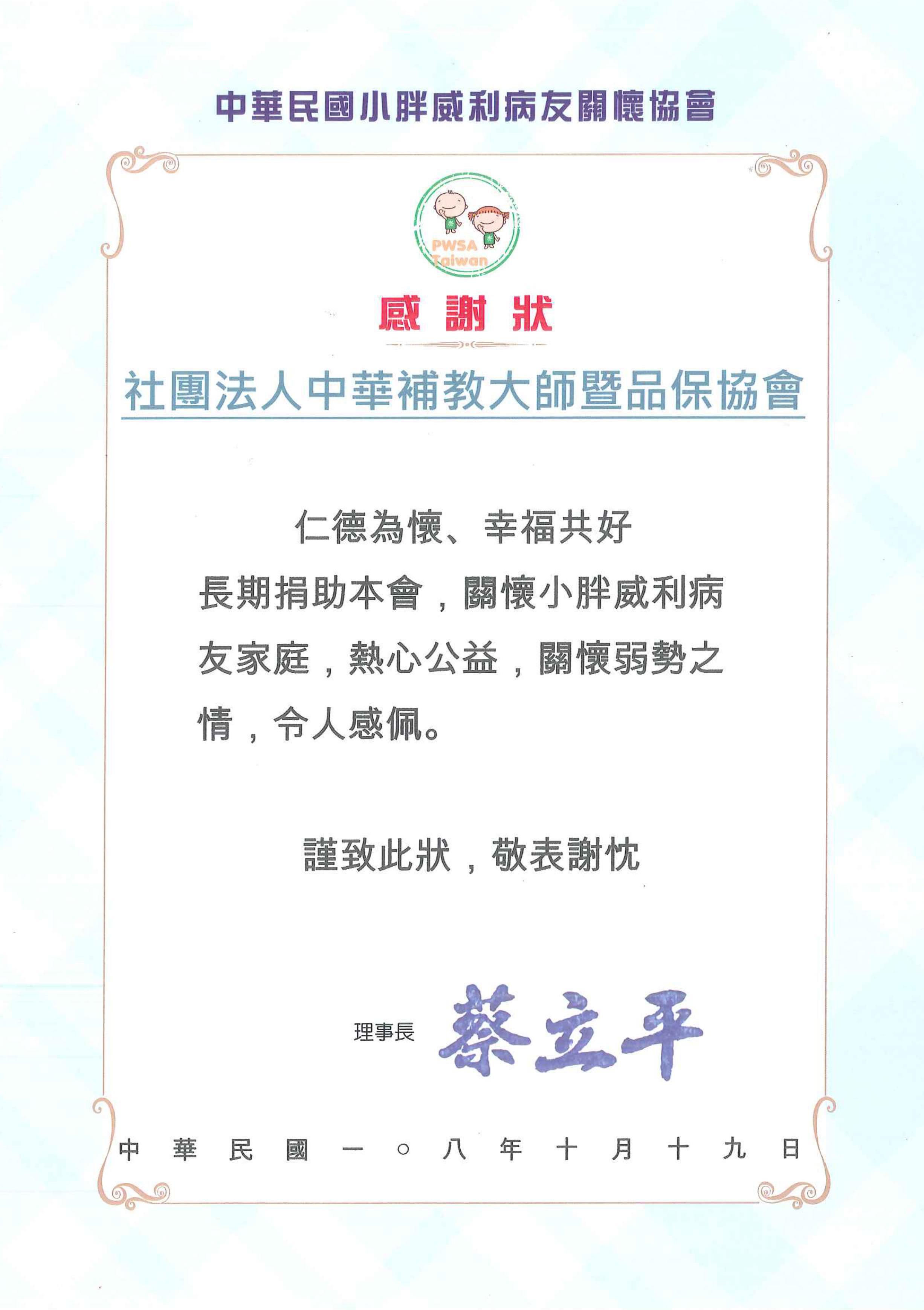 受證單位:社團法人小胖威利病友關懷協會、財團法人中華民國兒童癌症基金會